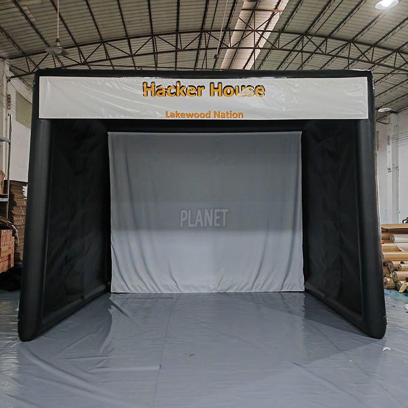 Cependant, il est important de prendre en considération le cadre réel lors de l'utilisation de la tente gonflable de simulateur de golf.l'arrière de la bâche doit s'étendre pour la protéger de la lumière qui pourrait affecter la projection.